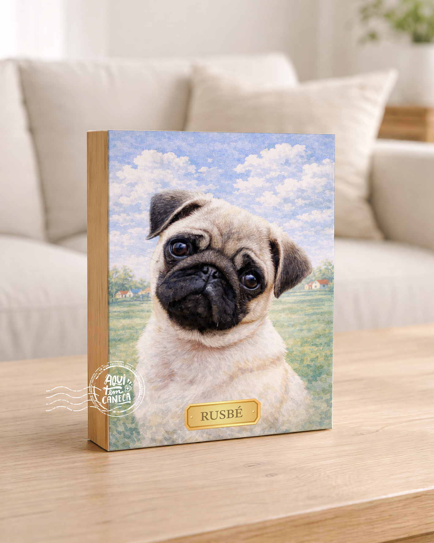 Quadro de mesa meu pet cachorro pug bege personalizado com nome 15x20cm